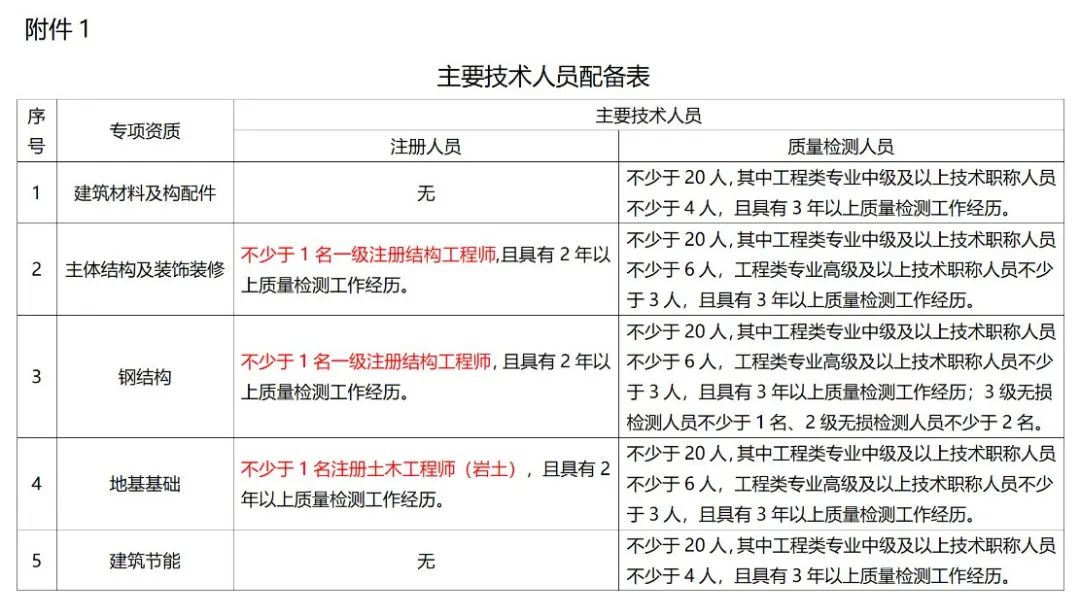 ⑵主体结构及装饰装修、钢结构、地基基础、建筑幕墙、道路工程、桥梁及地下工程等专项资质,应当具有3年以上质量检测经历。