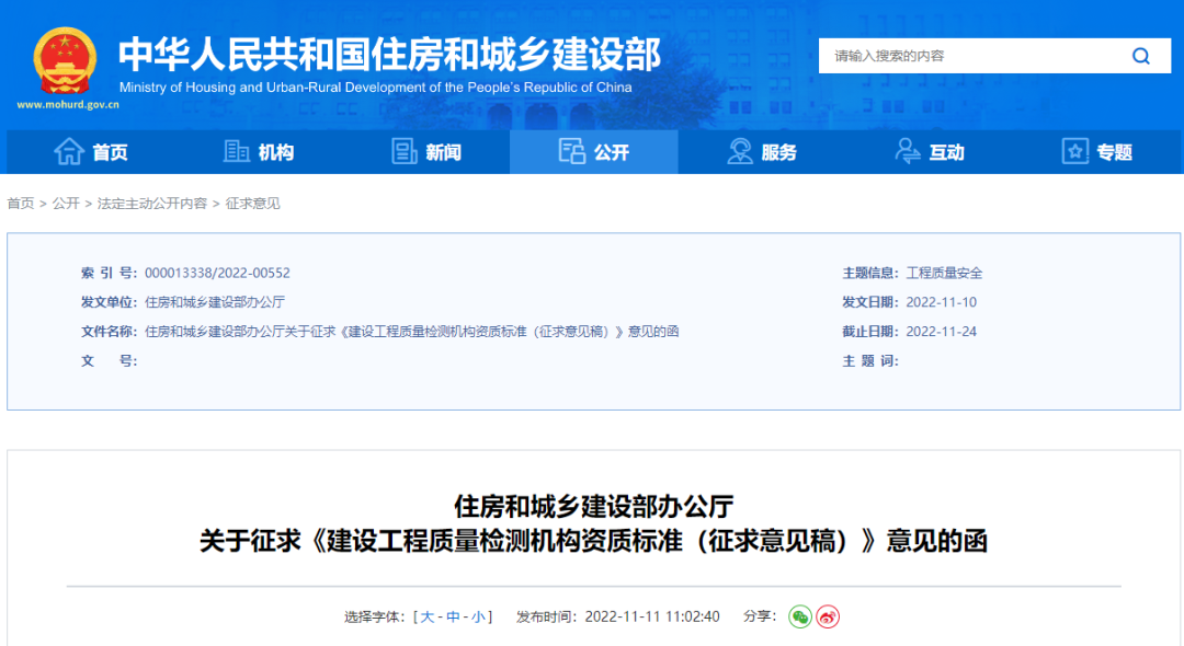 11月11日,住建部发布《关于征求《建设工程质量检测机构资质标准(征求意见稿)》意见的函》。本标准自2023年1月1日起施行。