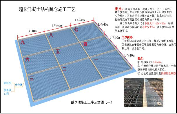 “跳仓法”即超长大体积混凝土结构跳仓法施工技术: