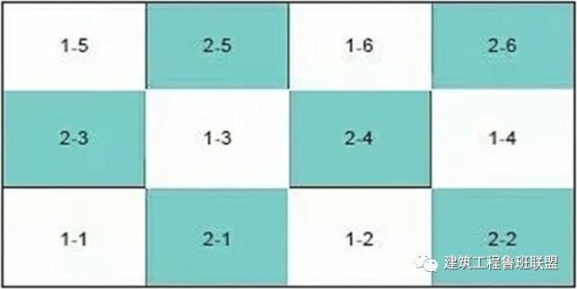 根据基础筏板面积大小沿长度和宽度方向各分为不大于40m的区格,沿各自方向分别编号。具体施工顺序是:先浇筑第一批即1-1~1-6,相隔不小于7d后再浇筑第二批即2-1~2-6。